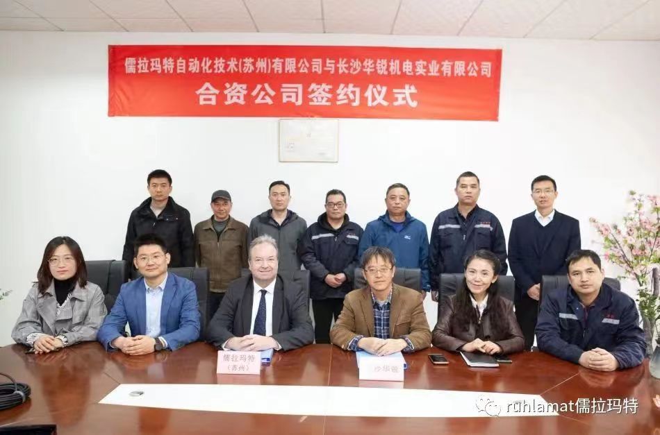 儒拉瑪特自動化技術(shù)(蘇州)有限公司與長沙華銳機電實業(yè)有限公司在長沙舉辦了合資公司簽約儀式,儒拉瑪特(蘇州)董事總經(jīng)理白世泰先生與長沙華銳總經(jīng)理王小明先生簽署合作協(xié)議。